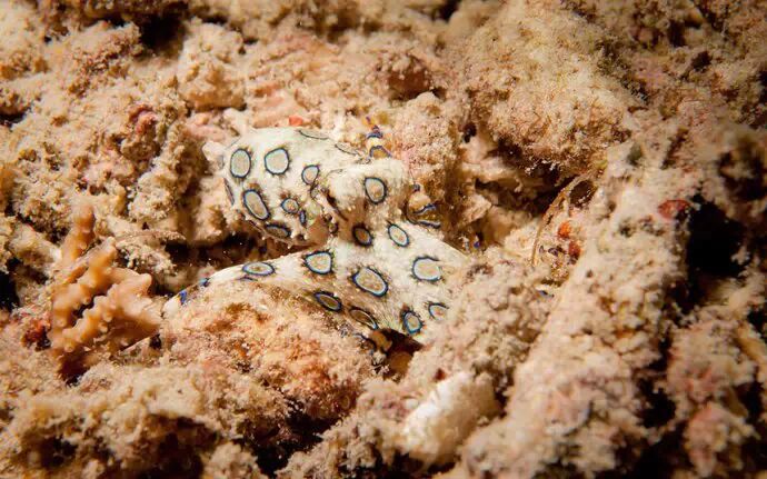 5 蓝圈章鱼 blue-ringed octopus 蓝圈章鱼的毒液足以毒死26人。蓝圈章鱼在受到骚扰后身体棕点变暗,蓝圈显现,会分泌出比氰化物还要强1万倍的神经毒素。尽管如此,死于蓝圈章鱼的人比死于吃河豚的人还要少,而河豚也会产生相同的神经毒素。 我会碰见它吗? Steve Backshall:”澳洲有数种蓝圈章鱼,其中一种就生活在悉尼港。它们个头很小,充满活力而且非常漂亮。如果你有幸看见它们,请保持一定的距离。“