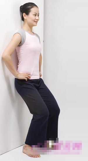 2、背部贴墙,弯曲膝盖,慢慢下蹲,膝盖不超过脚指头。停住10-15秒后回复原位,重复10次。