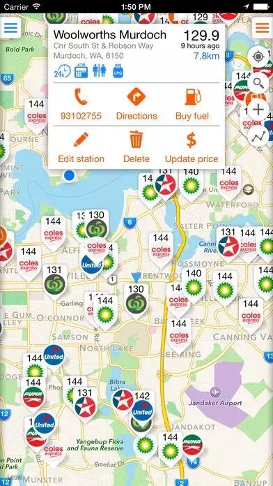 地图上会显示所有加油站的位置、品牌以及最新价格。
