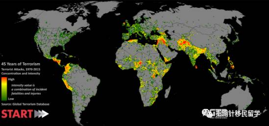 全球恐怖主义数据库最近发布了一项统计,包含了从1970年到2015年这45年来全世界发生的所有的恐怖袭击事件,用一张图告诉你世界恐袭的分布区。绿色,黄色和红色分别代表了不同的恐袭级别,红色为最严重的恐袭,死亡人数最多,造成的影响最大。